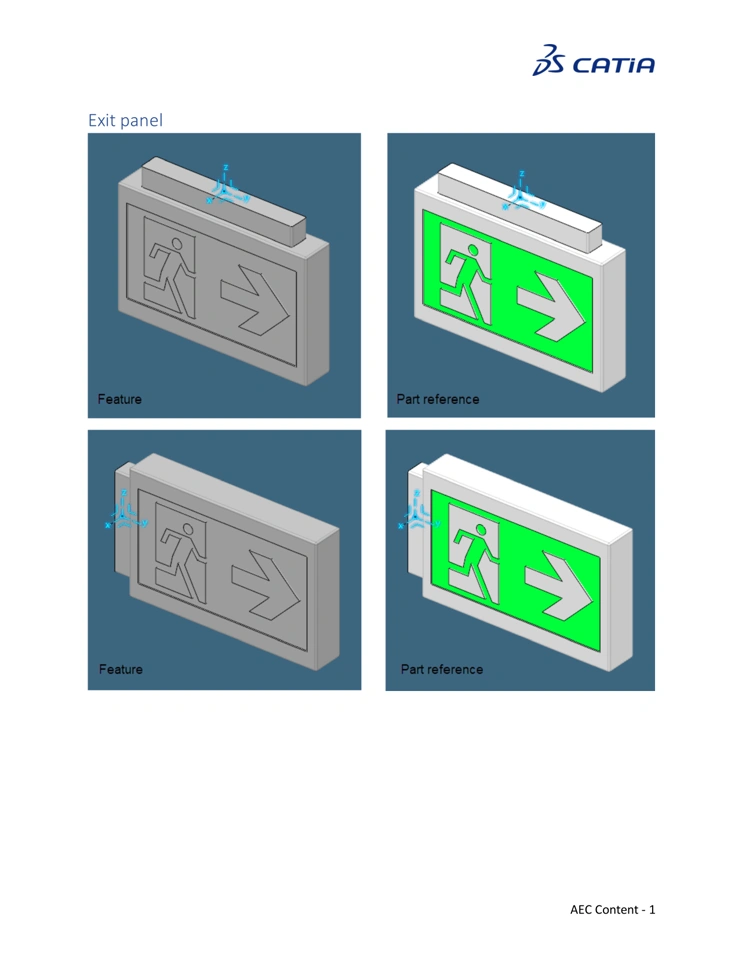 2026 content Security Reference Reference Images 3DXML: Object Type Name: OT-Security-Exit Signs Documentation:Input Axis System: The Input Axis System for the exit is centered on the surface. The X axis points to the exit panel front and the Y axis is along the exit arrow direction. Configurations: Red-Ceiling Mounted Red-Wall Mounted Green-Ceiling Mounted Green-Wall Mounted Full Documentation in PDF: