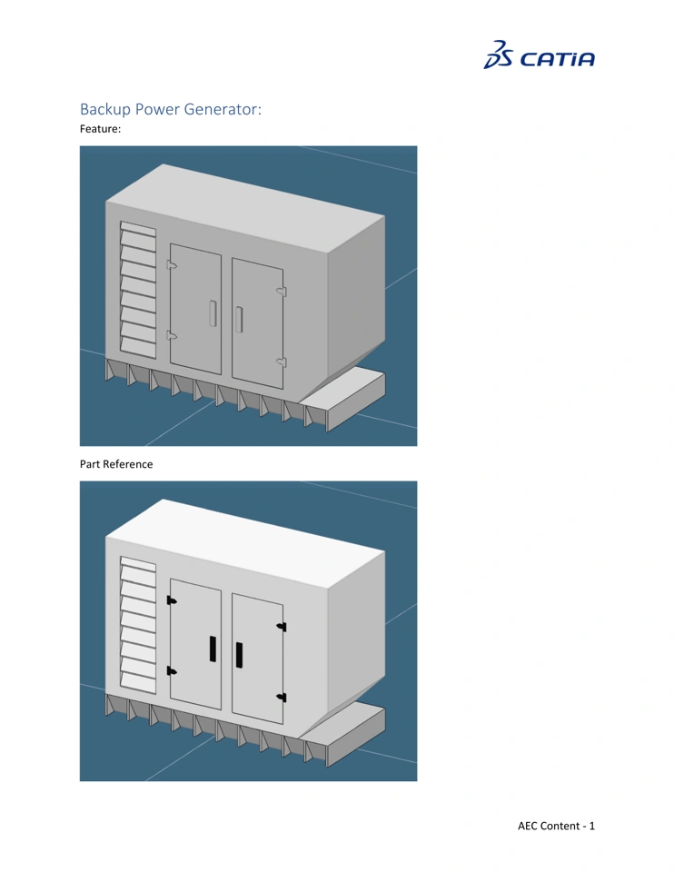 2026 content Equipment Reference Reference Image 3DXML: Object Type Name: OT-Construction Equipment-Backup Power Generator Documentation:Input Axis System: The input Axis System for the backup power generator is at the back the generator itself, centered and positioned on the floor. X axis is pointing to the front of the generator. Configurations: Small (20-30 kVA) - Integrated tank Small (20-30 kVA) - External tank Medium (60-120 kVA) - Integrated tank Medium (60-120 kVA) - External tank