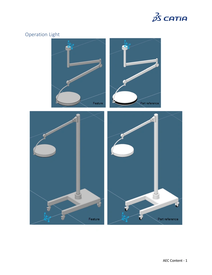 2026 Hospital content Equipment Reference Reference Image 3DXML: Object Type Name: OT-Hospital Equipment-Operating Lamp Documentation:Input Axis System: The Input Axis System for the operation lamp aligned with the lamp bulb center. The Y axis points along the support arm. The ceiling lamp configuration has the axis system on the ceiling while the standing configuration has the axis system on the floor. Configurations: Standing Lamp Ceiling Lamp Full Documentation in PDF: