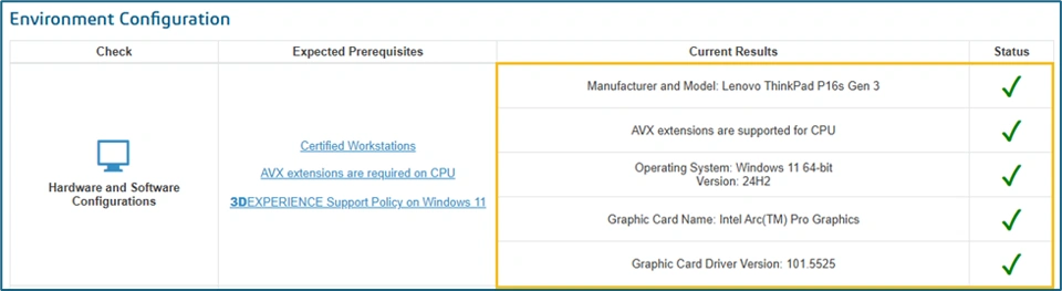 In recent times, multiple workstations has been certified by the Dassault Systèmes for supporting the 3DEXPERIENCE® Platform on the Cloud. All of these workstations are updated into Certified Workstations List for 3DEXPERIENCE® Platform on the Cloud and the Cloud Eligibility Checker tool does take these changes into account in Hardware and Software Configurations check as per below: