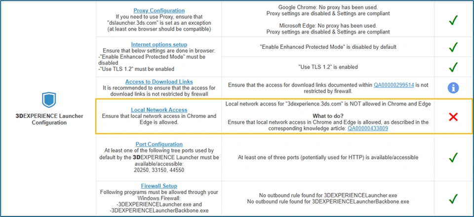 Local Network Access Check is part of 3DEXPERIENCE Launcher Configuration. It analyzes both browser policies and user-specific settings to determine whether Chrome and Edge are correctly configured as per below: